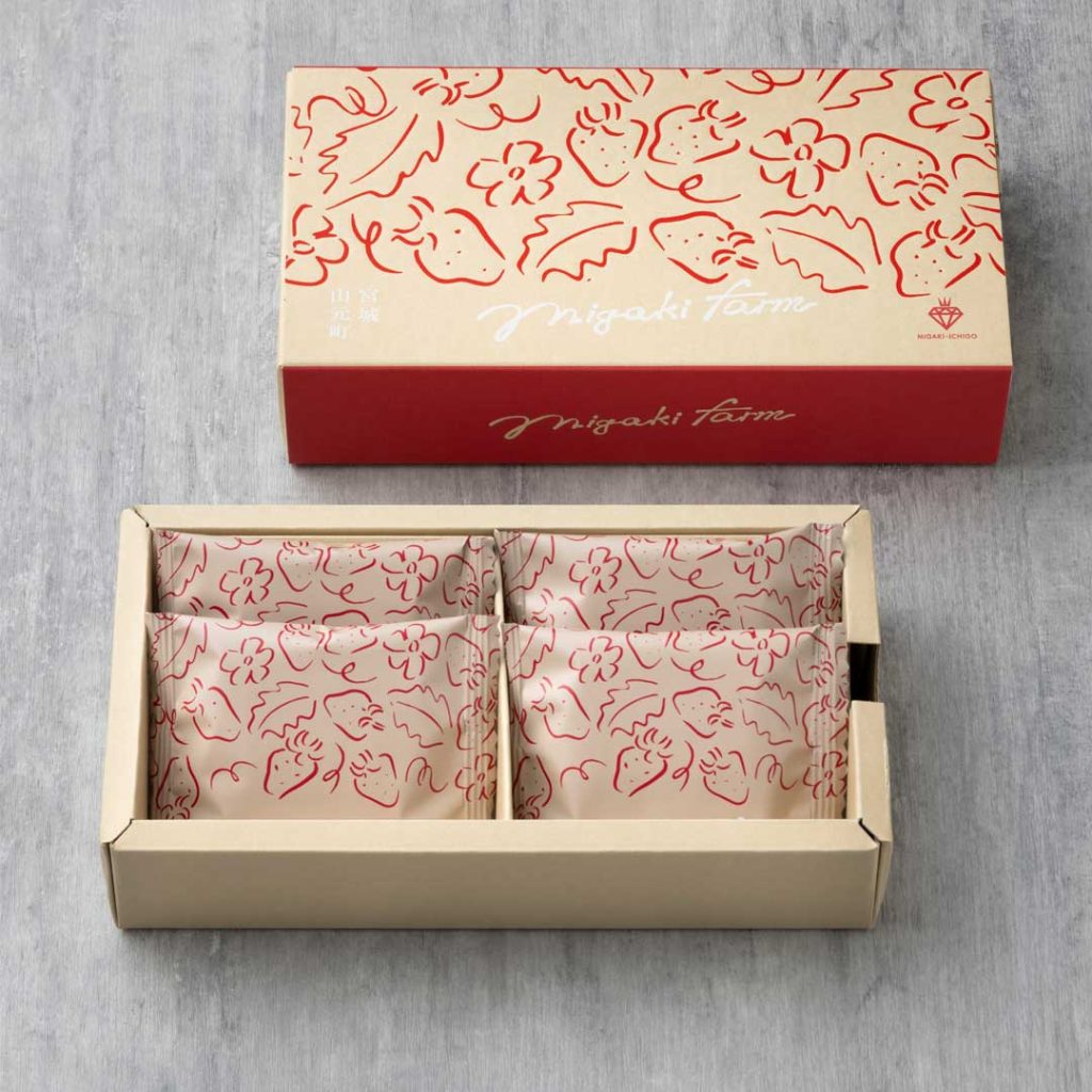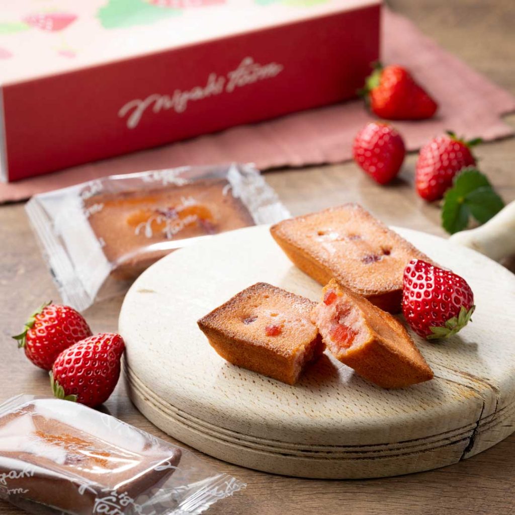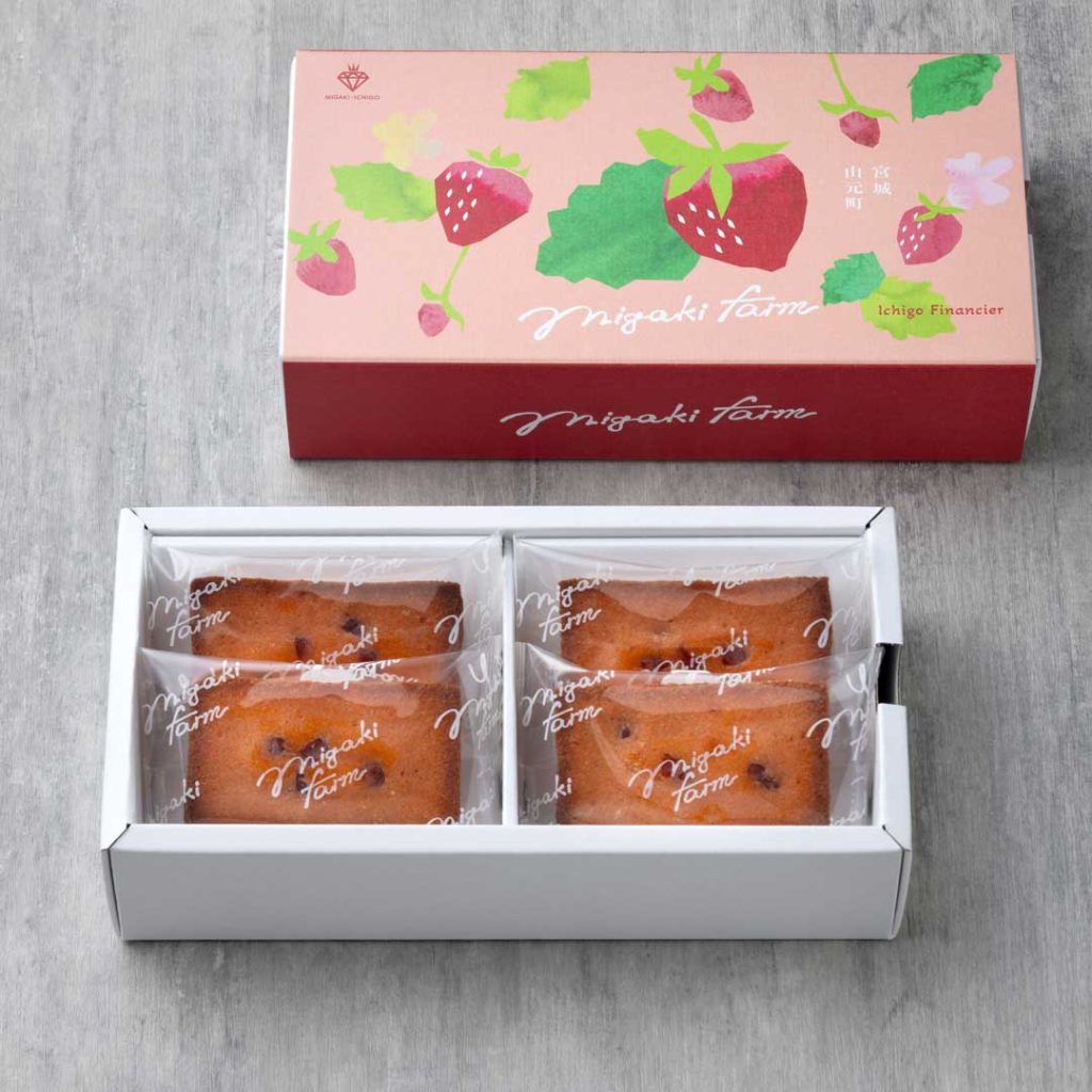 新しい東北のお土産として、ミガキイチゴを原料に「ミガキファームクラフト」という新ブランドでスイーツを販売開始しています。大人気のイチゴバターサンド(4個入り)、イチゴフィナンシェ(4個入り)、イチゴミルクサンドクッキー(4個入り)のセット商品となります。いずれも宮城限定販売商品となります。